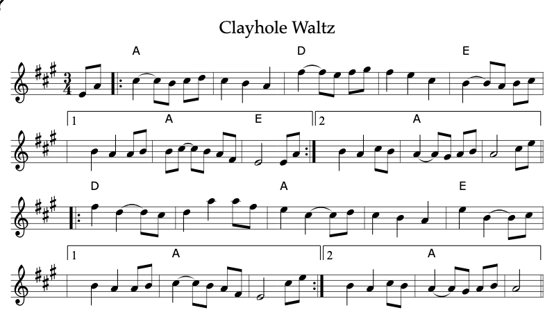 I learned Clayhole Waltz from Tony Mates, a long-time fixture of the Seattle old-time scene as a musician, caller, and mentor. I don’t remember if I learned this at the all-waltz jam session he once led or if it was at another jam, but it pretty quickly made it into my repertoire. Something about it has always felt sort of cowboy-ish to me, and it turns out that’s probably right: the clayhole in question was (according to the liner notes of Skip Gorman and Ron Kane’s “Powder River“) “an old camping spot near the Arizona-Utah border where lumberers, freighters and cowboys would rendezvous”. There’s a “Clayhole Wash” in the middle of nowhere about 20 miles south of the Arizona-Utah border, so maybe that’s the spot.
