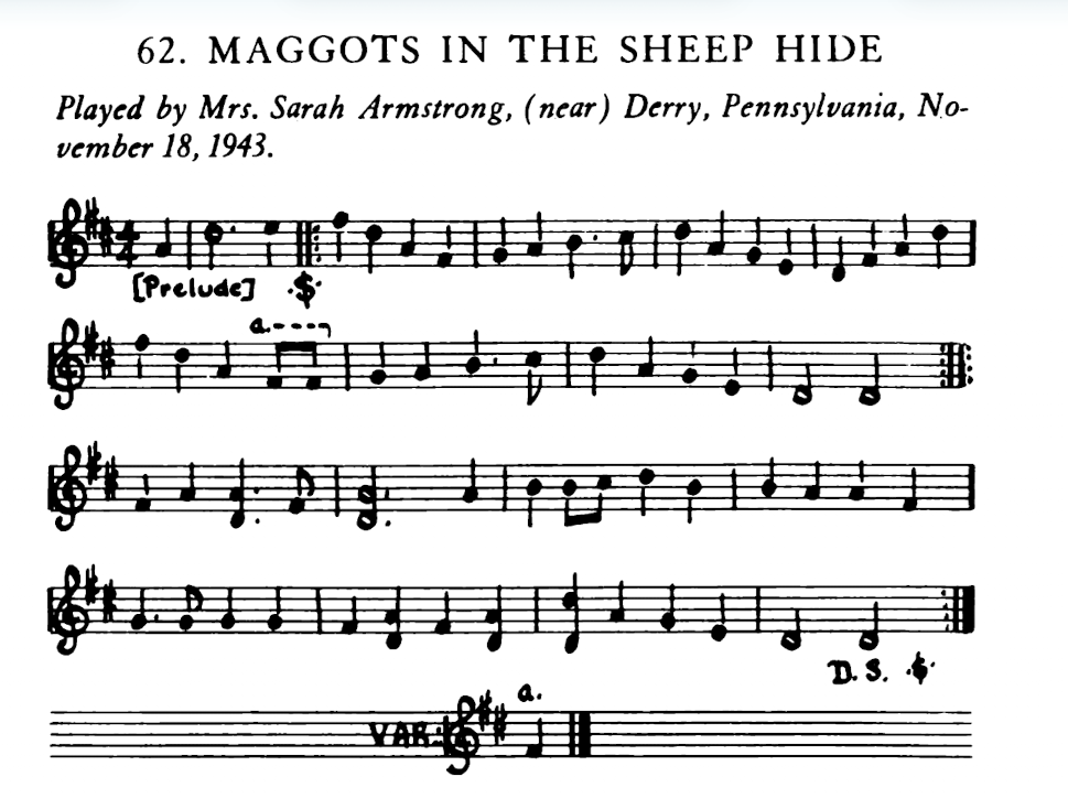 While researching this tune for the write-up, I discovered that I’ve been playing it a little differently than how it was transcribed (as seen above) in Hill Country Tunes, Samuel Preston Bayard’s 1944 collection of instrumental folk music of southwestern Pennsylvania. It’s one he collected from Sarah Armstrong, whose eponymous tune was featured here in December of 2020. There are some other good tunes which come from her, so keep an eye out for more of them in tunes of the month to come.