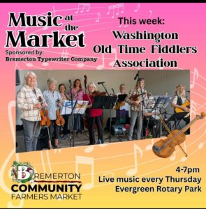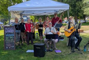We’ve enjoyed Farmer’s Markets, Ocean Shores Sand & Sawdust Festival, Crosby Days and playing in the barn at the Salmon Center in Belfair. After the campout, we will resume our monthly business meetings and jamming at the Kitsap Square Dance Hall from 11-3 in September. Our meetings are the third Saturday of every month. The first hour is play by ear, no written music, then a brief finger food business meeting break and then more jamming til 3 (with music stands if you wish!). It’s fun. Come join us!