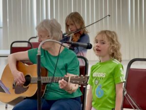 Our June bonus jam was a hit in part because it was Emma’s birthday. The family brought a cake to share and everyone sang and played for her 6th birthday. Also, Bernie has been making violins and brought the latest one for Bella (Emma’s older sister) to play. She played it throughout the day. I’m sure that Bernie enjoyed the fact that he made a violin that sounded so good that she wanted to keep playing it! There was a good turnout for this last jam before the summer break and everyone seemed to have a good time. Here are some pictures provided by Shawna: