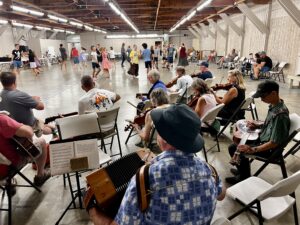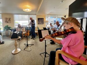 We’ve had quite a few playdates this summer and had to shuffle some folks around because of vacations and such. Thanks to Bernie for organizing the whole schedule and helping people sign up. He does a lot of work on this as well as plays at as many dates as he can. Thanks again to all who donate their time and talents at these monthly events to make the audience happy. It seems both the musicians and audience enjoy the music. Here’s a picture that Shawna took at a playdate this summer.